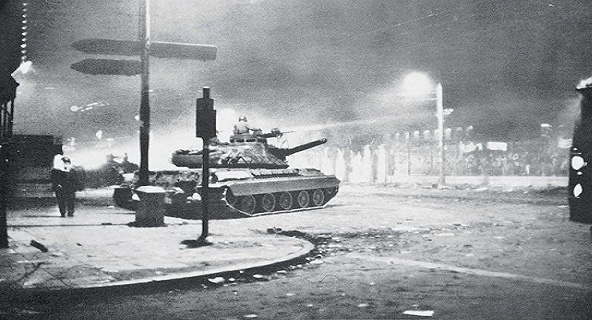 Η απριλιανή χούντα καταστέλλει την εξέγερση του Πολυτεχνείου με την εισβολή ενός τεθωρακισμένου άρματος από την κεντρική πύλη του ιδρύματος.