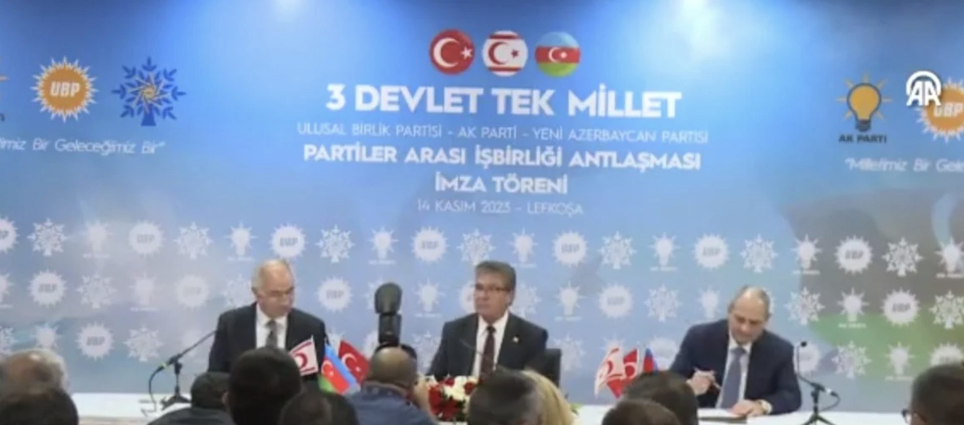 Υπό τον τίτλο «τρία κράτη, ένα έθνος» υπεγράφη χθες στην Λευκωσία συμφωνία μεταξύ εκπροσώπων του Κόμματος Δικαιοσύνης και Ανάπτυξης(AKΡ) του Ρετζέπ Ταγίπ Ερντογάν, του Κόμματος του Νέου Αζερμπαϊτζάν του Ιλχάμ Αλίεφ και του Κόμματος Εθνικής Ενότητας (UBP) του ψευδοκράτους. Πρόκειται για το κόμμα που ίδρυσε ο Ραούφ Ντενκτάς και του οποίου ηγήθηκε ο Ερσίν Τατάρ.