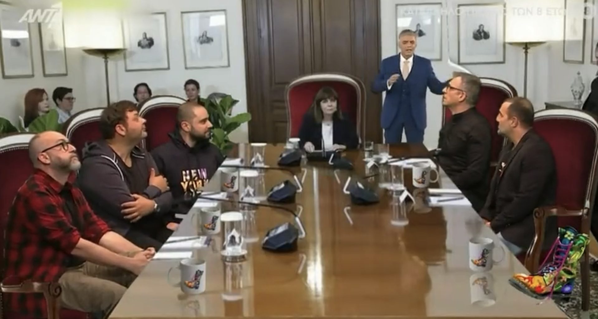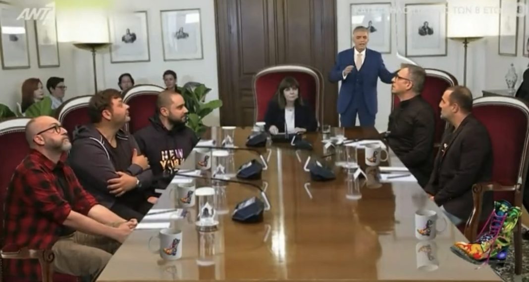 Εισβολή των Ράδιο Αρβύλα στο προεδρικό Μέγαρο με τα γραφικά του Νίκου Ευαγγελάτου με την Σακελλαρόπουλου εντελώς ακίνητη να τους παρακολουθεί…..