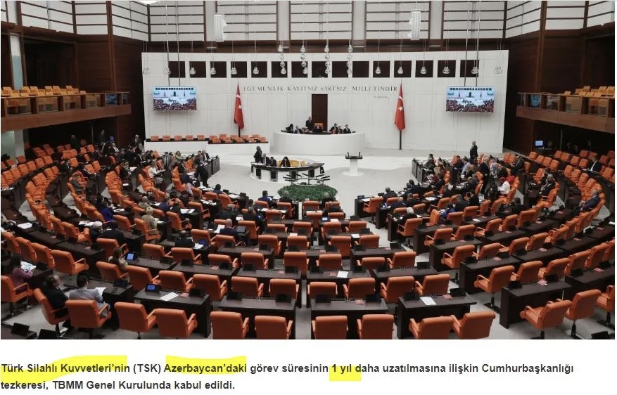 Στη Γενική Συνέλευση της της Μεγάλης Εθνοσυνέλευσης της Τουρκίας έγινε αποδεκτό το προεδρικό μνημόνιο σχετικά με την παράταση της περιόδου υπηρεσίας των Τουρκικών Ενόπλων Δυνάμεων (TAF) στο Αζερμπαϊτζάν για έναν ακόμη χρόνο, γράφουν τα τουρκικά μέσα ενημέρωσης.