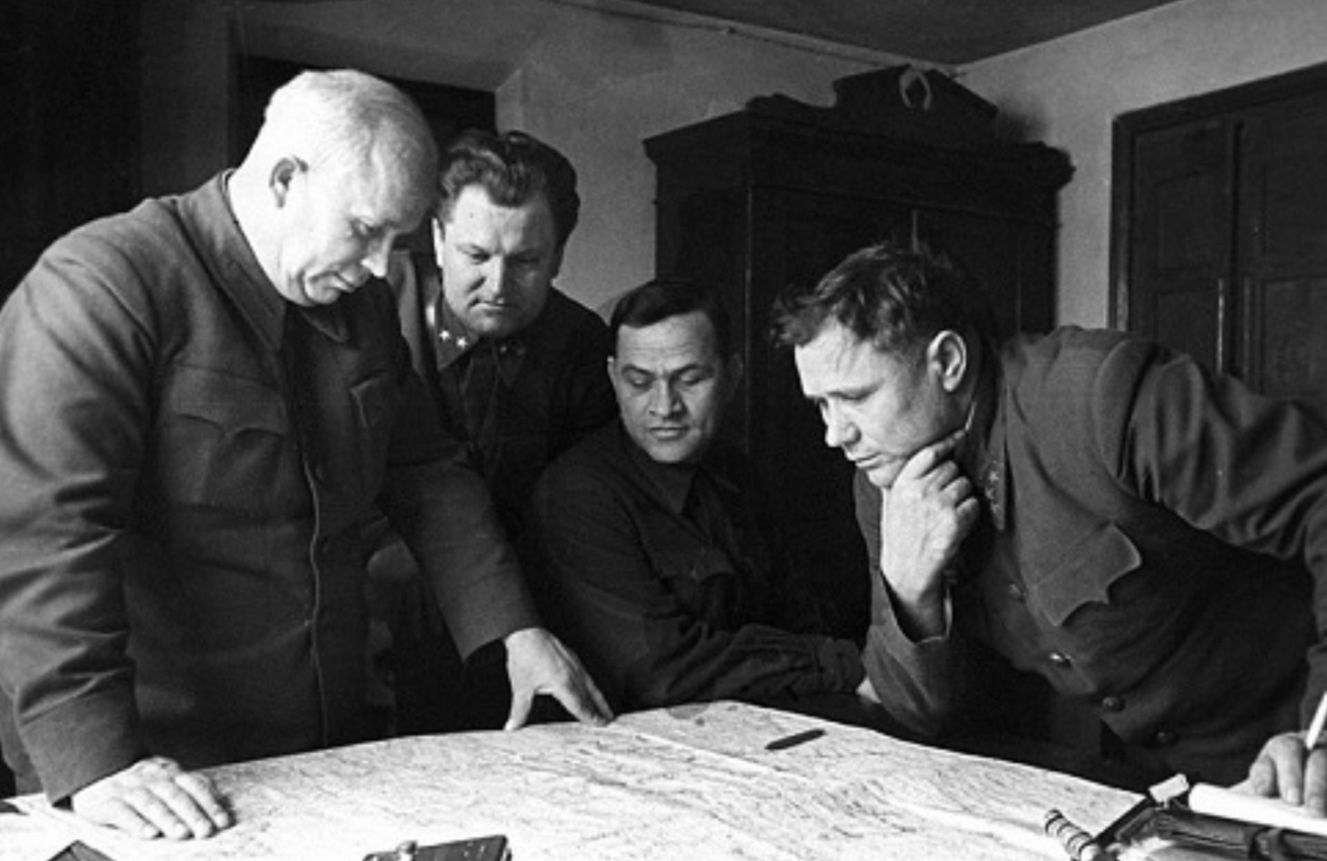 Φωτογραφία: Μέλη του Στρατιωτικού Συμβουλίου του Μετώπου του Στάλινγκραντ: Χρουστσόφ, Κιριτσένκο, Τσουγιάνοφ και ο Διοικητής Ερεμένκο, Δεκέμβριος 1942.