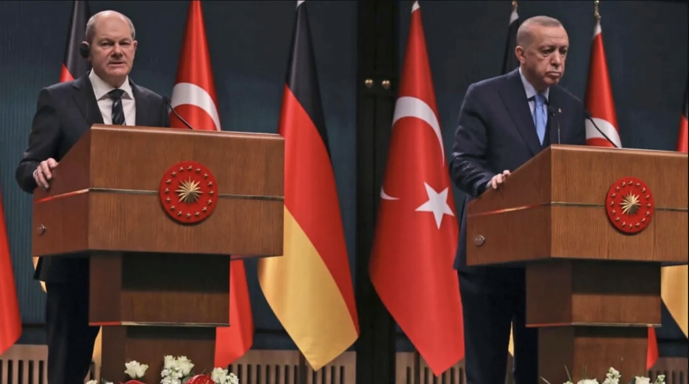 Ο Γερμανός Καγκελάριος Όλαφ Σολτς και ο Τούρκος Πρόεδρος κατά τη διάρκεια κοινής συνέντευξης Τύπου στην Άγκυρα, 2022.