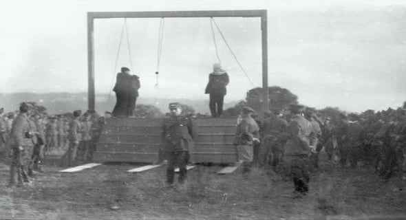 Η μεγάλη στιγμή έχει φθάσει. Στις 9:21 π.μ, ο επικεφαλής αξιωματικός του εκτελεστικού αποσπάσματος ανθυπασπιστής Κυριακού δίνει το πρόσταγμα «Σύρατε!». Τα ανάβαθρα σύρονται απότομα και τα δύο σώματα αιωρούναι άψυχα στο κενό. Στη συνέχεια, τα στρατιωτικά τμήματα παρελαύνουν μπροστά από το ικρίωμα και η σεμνή τελετή λαμβάνει τέλος.