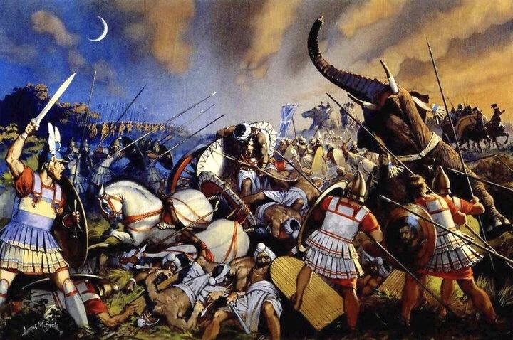 Οι ελέφαντες φυσικά αντιδρούσαν. Κάποιους μακεδόνες στρατιώτες τους πατούσαν κάτω, συνθλίβοντας τους σε μια ματωμένη μάζα σάρκας και πανοπλίας. Άλλους τους έπιαναν με τις προβοσκίδες τους και τους πετούσαν στο έδαφος με ορμή. Άλλους πάλι τους ανασκολόπιζαν με τους τεράστιους χαυλιόδοντές τους.