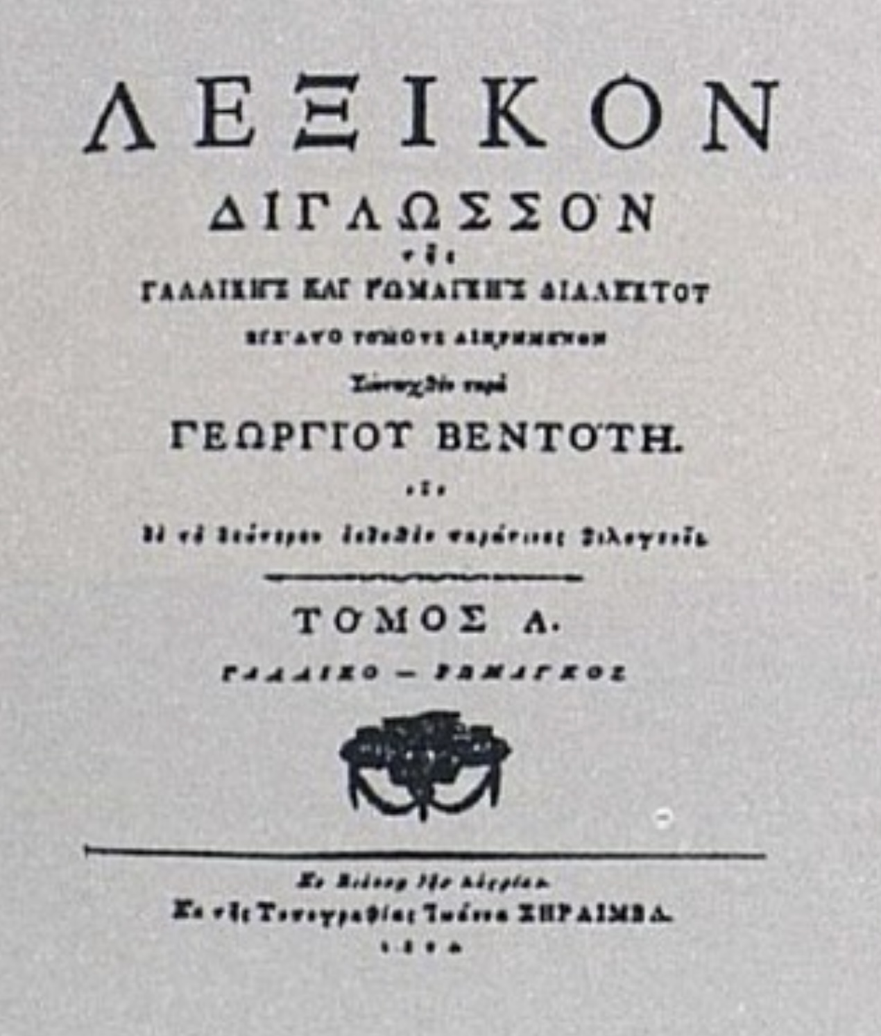 Φωτογραφία: Τυπογραφείο Σχραίμβλ, Βιέννη, 1804 – http://www.lexilogia.grΤο δίγλωσσο Λεξικό, του Γεωργίου Βενδότη του 1804