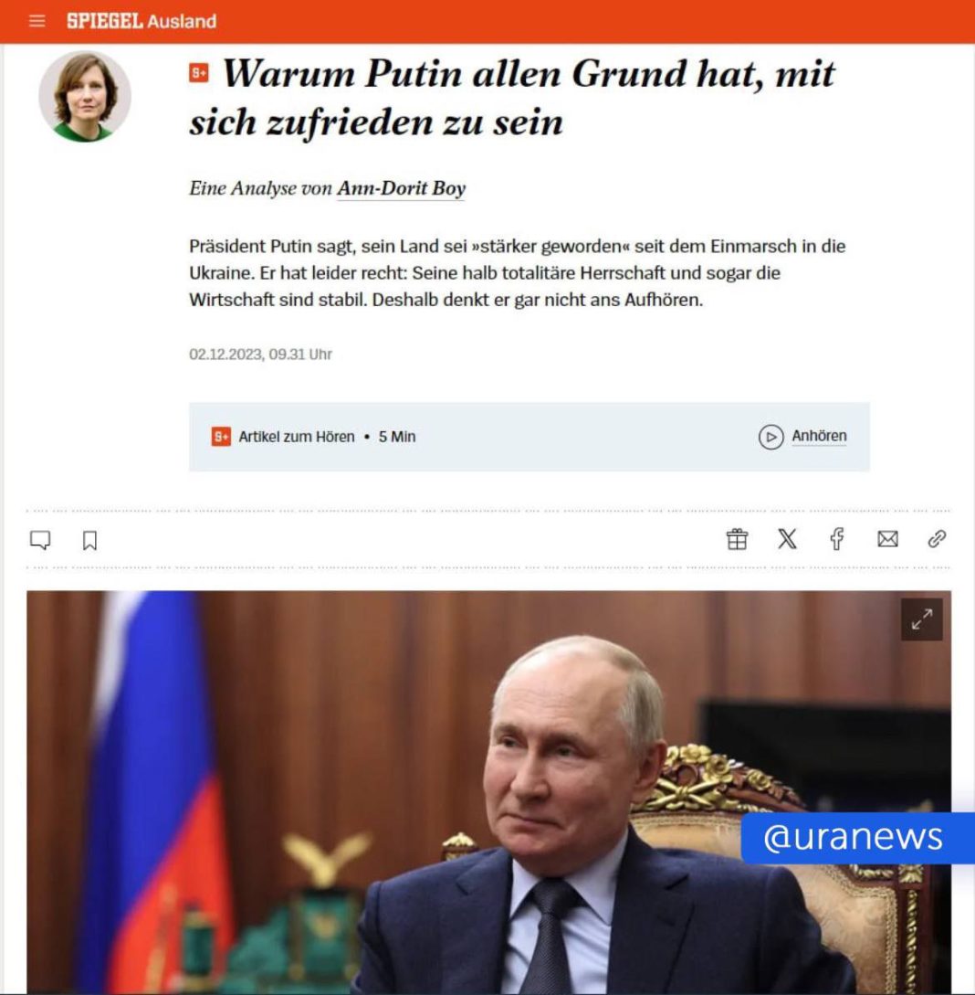 Το άρθρο αναφέρει ότι η Δύση έχει από καιρό πειστεί για την αποτυχία της, αλλά μετά από 21 μήνες σύγκρουσης, «ο Ρώσος ηγεμόνας λειτουργεί τέλεια». Η οικονομία της Ρωσίας έχει αναπτυχθεί από τότε που ξεκίνησε η σύγκρουση, ο Πούτιν μιλά στη συνεδρίαση της G20, δεν υπάρχουν προβλήματα στο εσωτερικό της χώρας και τα πράγματα πάνε καλά στο μέτωπο, αναφέρει το Spiegel.