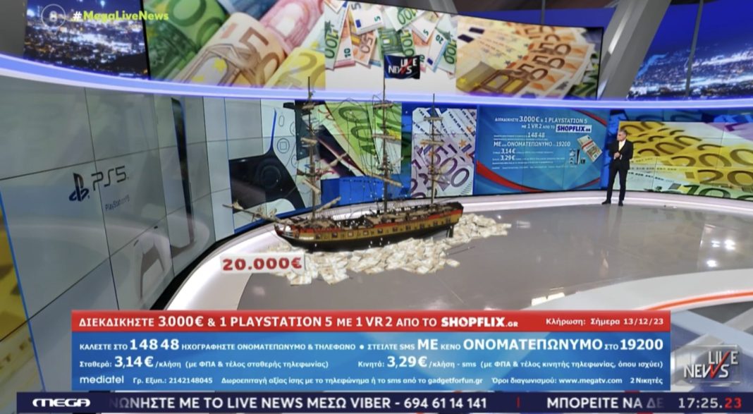 Πιστός στα “έξυπνα” γραφικά ο Νίκος Ευαγγελατος, αν και δεν καταλάβαμε αν προπαθησε να μπει στο πνεύμα των Χριστουγέννων με ένα στολισμένο καραβάκι η ηθελε να δείξει ένα πειρατικό καράβι που φέρνει δωρα και λεφτά.