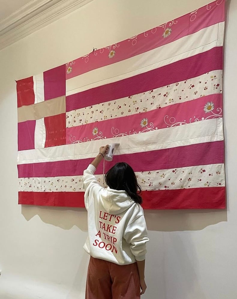 Μια διαφορετική Ελληνική σημαία, φτιαγμένη από κλινοσκεπάσματα, σε χρώμα ροζ, παρουσιάστηκε σε έκθεση στο Γενικό Προξενείο μας στη Νέα Υόρκη.