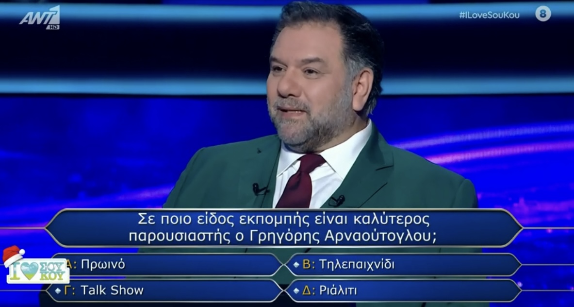 Την ευφάνταστη ιδέα να δώσει συνεντευξη στην Μπεττυ Μαγγίρα ο Γρηγόρης Αρναούτογλου μεσα στο πλατό του Ποιος θέλει να γίνει εκατομμυριούχος είχαν στον Αντ1. Μια συνεντευξη με 5 βασικές ερωτήσεις με την Μπεττυ Μαγγίρα στον ρόλο της παρουσιάστριας του παιχνιδου και τον Γρήγορη Αρναούτογλου στη θέση του παίχτη που απαντά.