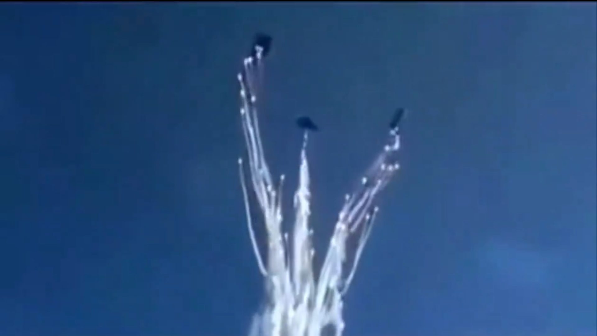 Επίδειξη δεξιοτεχνίες από τους Ρώσους πιλότους, όπου τέσσερα μαχητικά αεροσκάφη καταφέρνουν και σχηματίζουν έναν άγγελο στον ουρανό.