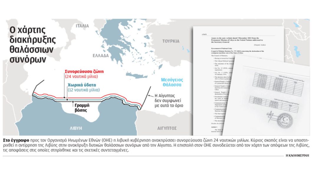 Συγκεκριμένα, η κυβέρνηση με έδρα την Τρίπολη (η υποτιθέμενη κυβέρνηση Εθνικής Ενότητας) κοινοποίησε στα Ηνωμένα Έθνη την απόφασή της για τα χωρικά ύδατα των 12 ναυτικών μιλίων αλλά και τη δήλωση για συνορεύουσα ζώνη 24 μιλίων προς τα βόρεια, κάτι που χαρακτήρισε «δικαίωμα της σύμφωνα με τη Σύμβαση των Ηνωμένων Εθνών για το Δίκαιο της Θάλασσας».