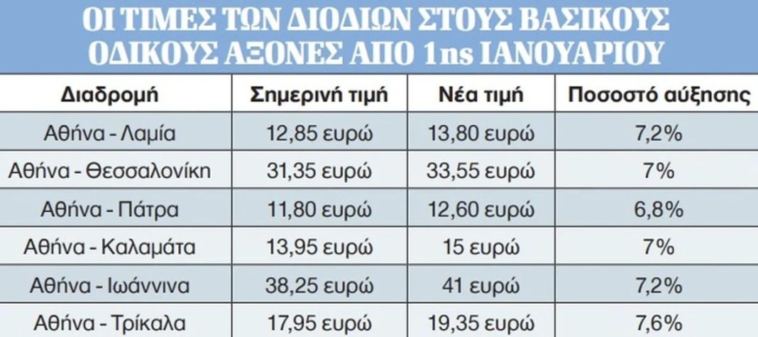 Οι αυξήσεις κυμαίνονται από 7% έως 7,5%, ποικίλουν ανάλογα με την κατηγορία οχήματος και αφορούν όλους τους αυτοκινητοδρόμους εκτός από την Αττική οδό και την Εγνατία Οδό. Για παράδειγμα, το οδικό ταξίδι Αθήνα – Θεσσαλονίκη μετ’ επιστροφής θα κοστίζει πλέον 67,10 ευρώ, αντί 62,70 ευρώ σήμερα!