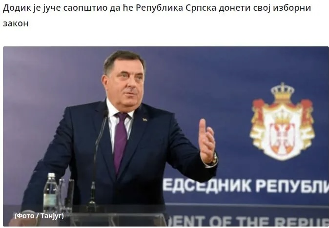 Ο Ντόντικ ανακοίνωσε χθες ότι «η Ρεπούμπλικα Σέρπσκα θα περάσει τον εκλογικό της νόμο, ο οποίος προβλέπει τη συνταγματική τοποθέτηση και ο οποίος θα προβλέπει ότι η εκλογική επιτροπή της Δημοκρατίας Σέρπσκα θα διεξάγει δημοτικές και δημοκρατικές εκλογές».