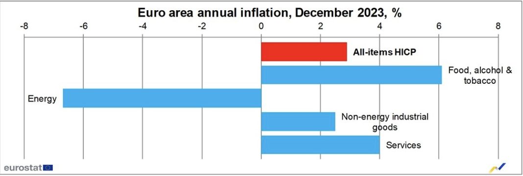 Ο ετήσιος πληθωρισμός της Ευρωζώνης αναμένεται να είναι 2,9% τον Δεκέμβριο του 2023, από 2,4% τον Νοέμβριο, σύμφωνα με την προκαταρκτική εκτίμηση της Eurostat, της στατιστικής υπηρεσίας της Ευρωπαϊκής Ένωσης, η οποία δημοσίευσε σήμερα τα σχετικά στοιχεία.