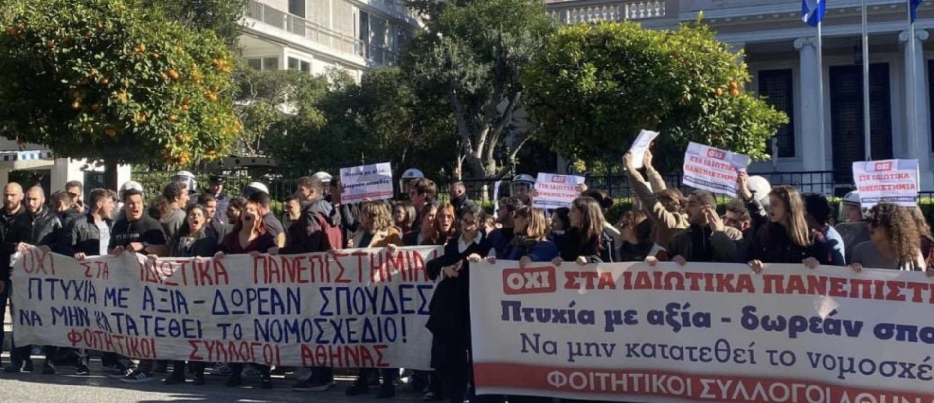 Έξω από το Μέγαρο Μαξίμου συγκεντρώθηκε νωρίτερα πλήθος φοιτητών προκειμένου να εκφράσουν την έντονη αντίθεσή τους προς τα ιδιωτικά πανεπιστήμια.