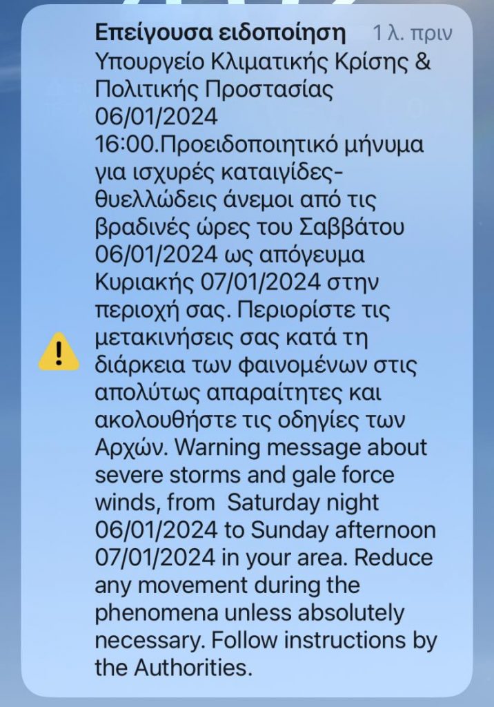 Μήνυμα στους πολίτες της Ηλείας και της Δυτικής Ελλάδας εστάλη περίπου στις 4 το απόγευμα από το “112” προειδοποιώντας για την επιδείνωση του καιρού που αναμένεται τις απογευματινές ώρες του Σαββάτου (06/01).