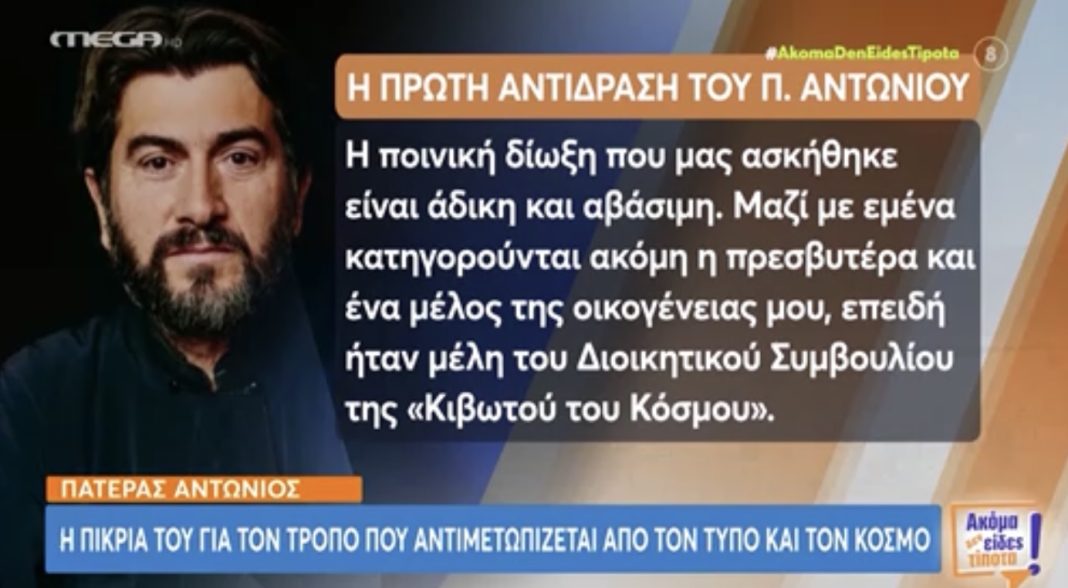Μετά την άσκηση ποινικής δίωξης για απιστία, υπεξαίρεση και ξέπλυμα μαύρου χρήματος στον ιδρυτή της «Κιβωτού του Κόσμου» και την πρεσβυτέρα Σταματία Γεωργαντή, ο πατήρ Αντώνιος δίνει την δική του εκδοχή για τις εξελίξεις. Διώξεις για συνέργεια ασκήθηκαν και σε δύο στενούς συνεργάτες τους, κάτι που ενοχλεί ιδιαιτέρως τον ιερέα.