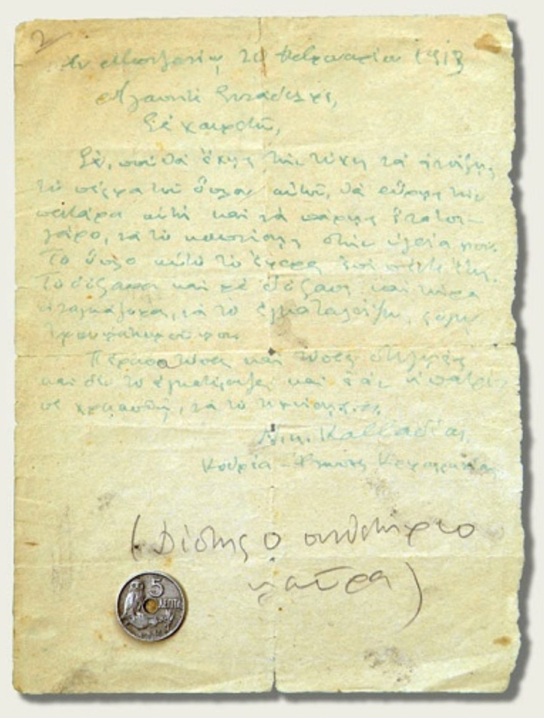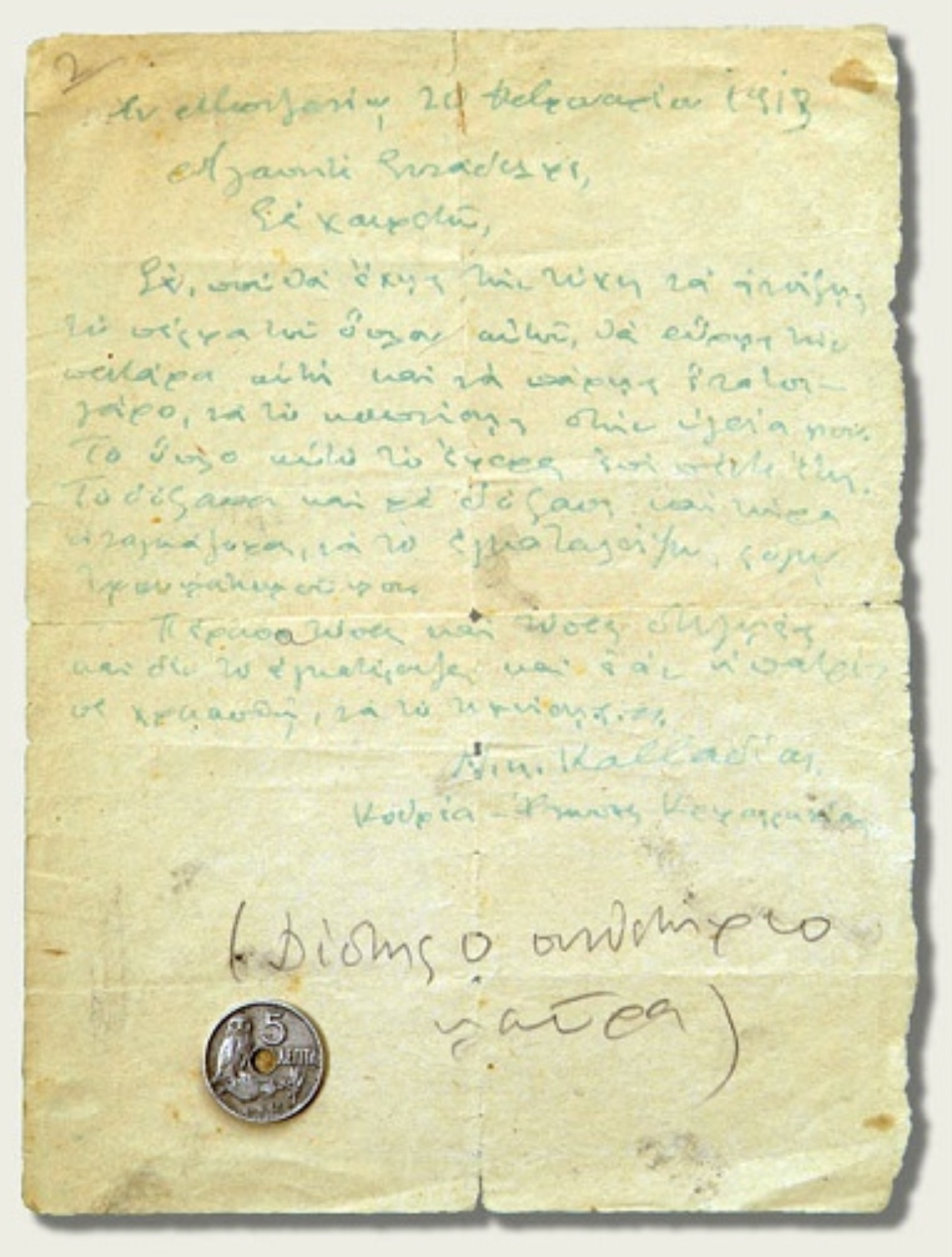 Ο Λάμπης Βολονάκης, λοχίας του Α’ λόχου του 17ου Συντάγματος Πεζικού υπηρετούσε στη Μικρά Ασία το 1920. Καθαρίζοντας το όπλο του βρήκε ένα σημείωμα και μια πεντάρα.