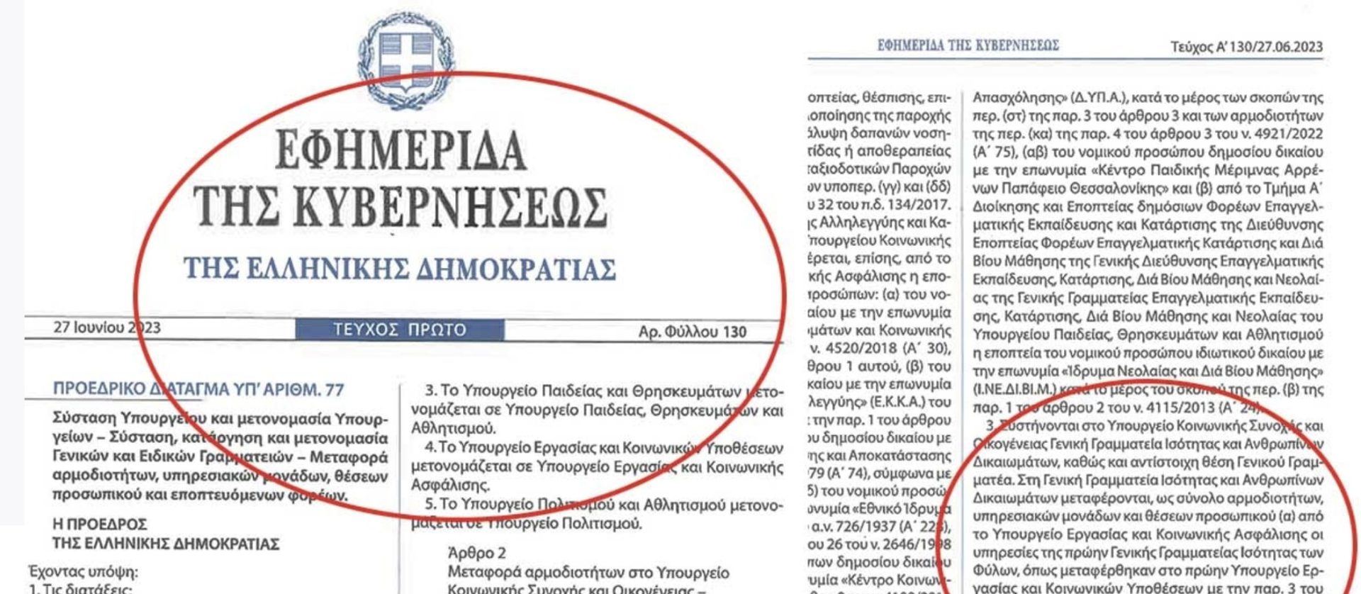 Με το άρθρο 1 του Π.Δ. 77/2023, συστήνεται το Υπουργείο Κοινωνικής Συνοχής και Οικογενείας και, συμφώνως προς το άρθρο 3, υπάγεται στο τελευταίο η Γενική Γραμματεία Ισότητας και Ανθρωπίνων Δικαιωμάτων (στην οποία μετονομάζεται η Γενική Γραμματεία Δημογραφικής και Οικογενειακής Πολιτικής και Ισότητας των Φύλων). Τα… «Ανθρώπινα Δικαιώματα», δηλαδή, κατήργησαν τα δυο φύλα!