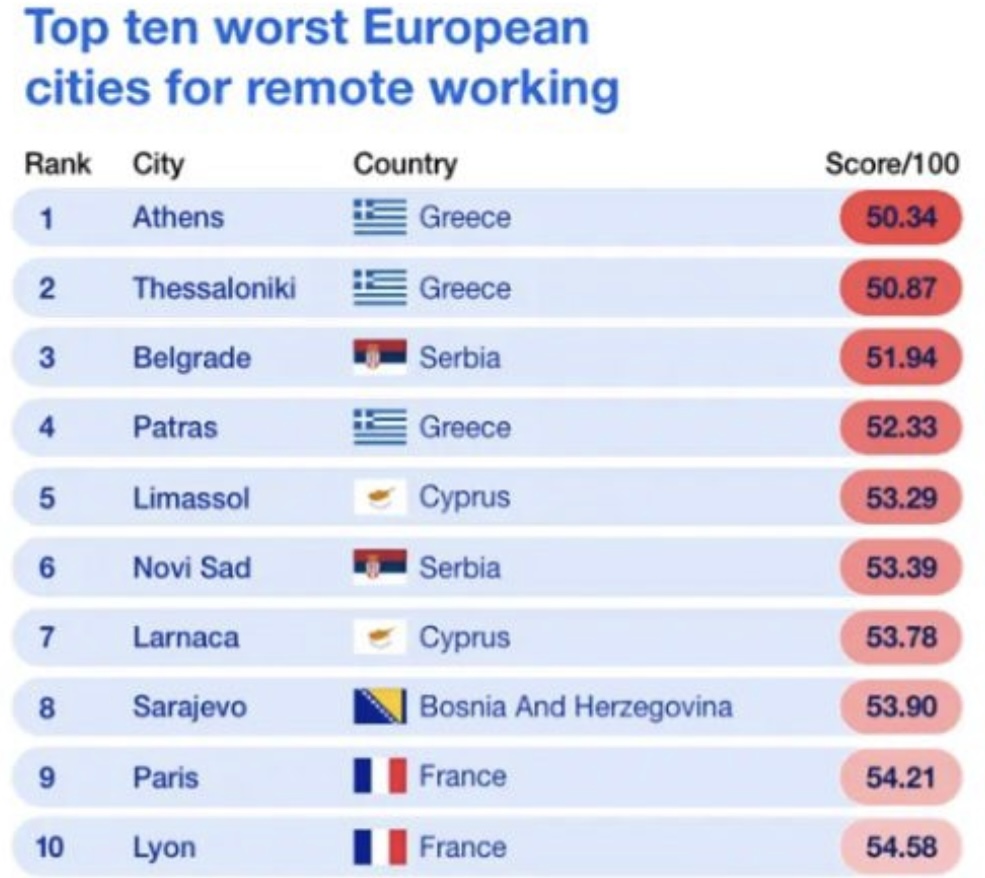 Σύμφωνα με την Rebecca Ann Hughes που υπογράφει το άρθρο στο Forbes «Παρά το γεγονός ότι είναι γνωστή για την ιστορία αιώνων που έχει, και χαρακτηρίζεται ως το λίκνο του δυτικού πολιτισμού, η Αθήνα κατατάσσεται ως η χειρότερη ευρωπαϊκή πόλη για τους εργαζόμενους σε τηλεεργασία, με την χαμηλή βαθμολογία 50,34 στα 100».