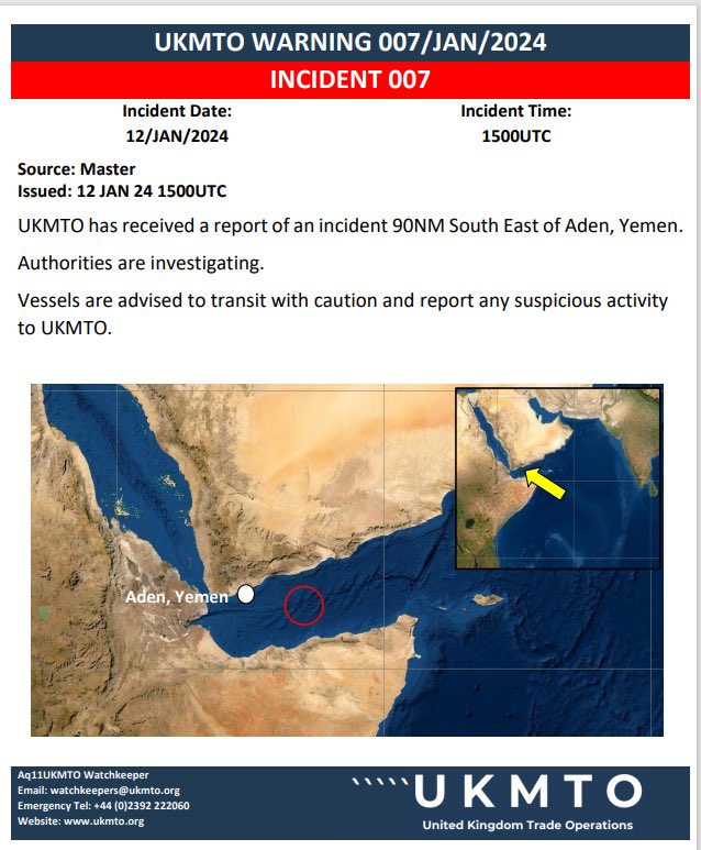 Η υπηρεσία θαλάσσιων εμπορικών επιχειρήσεων του Ηνωμένου Βασιλείου (UKMTO) ανακοίνωσε ότι έλαβε αναφορά για περιστατικό στην Ερυθρά Θάλασσα κοντά στην Υεμένη, με το συμβουλευτικό σημείωμα της υπηρεσίας να επισημαίνει πως το περιστατικό συνέβη 90 ναυτικά μίλια νοτιοανατολικά του Άντεν. «Οι αρχές διεξάγουν έρευνα», αναφέρεται στο σημείωμα, όπου επισημαίνεται πως τα σκάφη καλούνται να «διέρχονται με προσοχή» και να αναφέρουν οποιαδήποτε «ύποπτη δραστηριότητα» στην υπηρεσία.