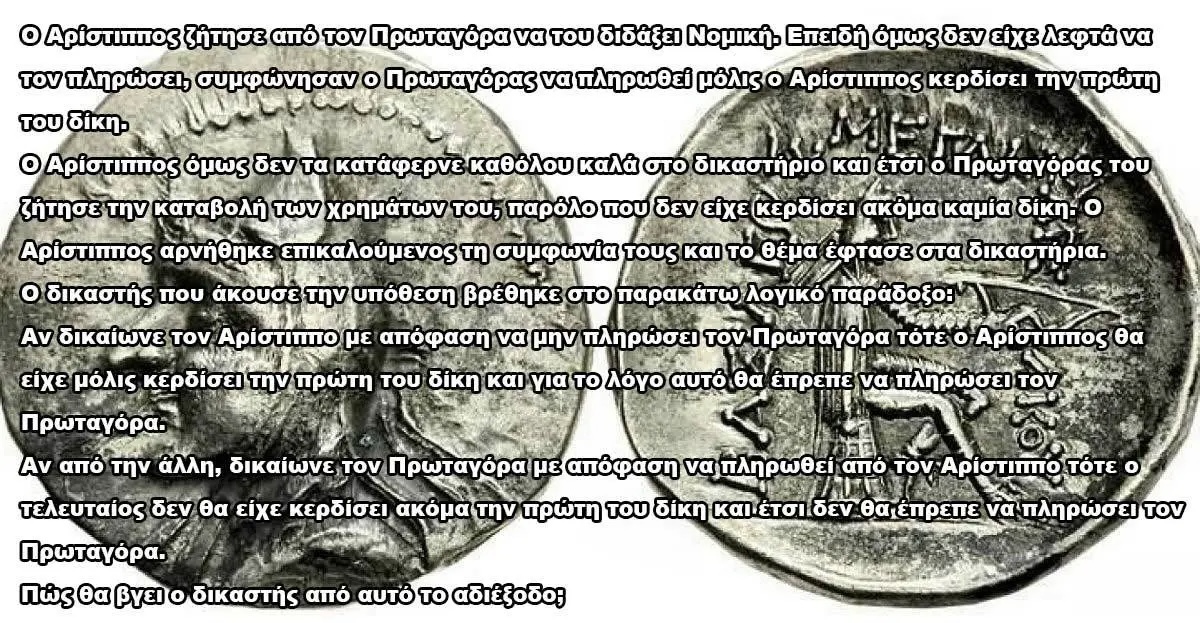Αν δικαίωνε τον Αρίστιππο με απόφαση να μην πληρώσει τον Πρωταγόρα τότε ο Αρίστιππος θα είχε μόλις κερδίσει την πρώτη του δίκη και για το λόγο αυτό θα έπρεπε να πληρώσει τον Πρωταγόρα.