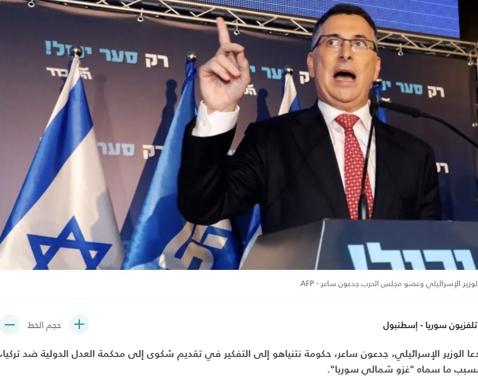Ο Ισραηλινός υπουργός Γκίντεον Σαάρ κάλεσε την κυβέρνηση του Νετανιάχου να εξετάσει το ενδεχόμενο υποβολής καταγγελίας στο Διεθνές Δικαστήριο κατά της Τουρκίας, λόγω της «εισβολής στη βόρεια Συρία», γράφει αραβικό δημοσίευμα.