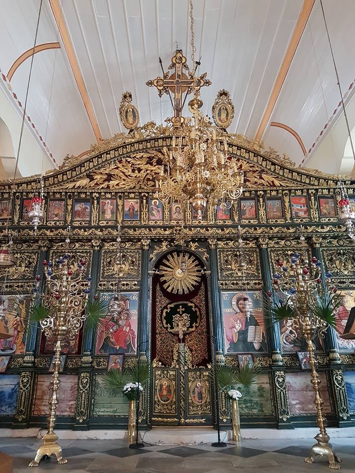 Το θαυμάσιο ξυλόγλυπτο τέμπλο είναι τριζωνικό, χωρισμένο από πεσσίσκους σε 15 διάχωρα, σε τρία από τα οποία ανοίγονται οι θύρες του ιερού. Στη μεσαία ζώνη του Τέμπλου έχουμε τις δεσποτικές εικόνες και στην ανώτερη 27 μικρές εικόνες με παραστάσεις από το Δωδεκάορτο, αγίους κτλ. Το κατώτερο τμήμα του τέμπλου κοσμούν ωραίοι πίνακες με γκριζοχρωμίες οι οποίοι απεικονίζουν φανταστικά ή πραγματικά τοπία , κτίσματα και πόλεις, πύργους, μοναστήρια και μέγαρα σε παραστάσεις παρόμοιες με εκείνες που συναντώνται σε κοσμικές τοιχογραφίες αρχοντικών της εποχής.