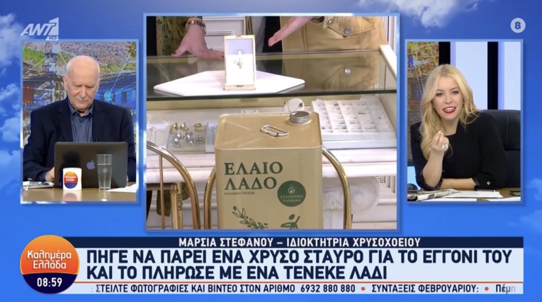 «Έρχεται ένας παππούς, γνωστός μου, και μου λέει ότι ήθελε να αγοράσει κάτι για το εγγονάκι του. Του λέω ‘τι να σου δείξω;’. ‘Ένα σταυρουδάκι’ μου απάντησε. Του λέω: ‘θα πληρώσετε με κάρτα ή μετρητά;’. Και μου απάντησε: ‘θα σε πληρώσω σε είδος’. Σάστισα λίγο», είπε η ιδιοκτήτρια του κοσμηματοπωλείου, μιλώντας στον τηλεοπτικό σταθμό Ant1.