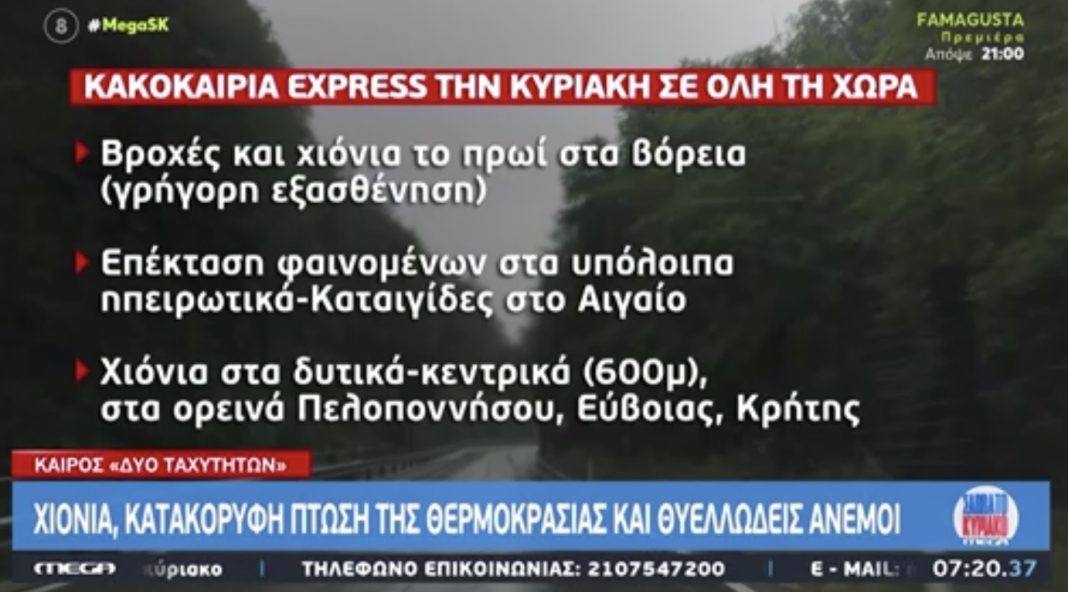 Χιονοπτώσεις θα σημειωθούν κατά τόπους στη βόρεια Ελλάδα ακόμα και στα πεδινά, στη Θεσσαλία και τη Στερεά Ελλάδα στα ορεινά και ημιορεινά και στην Πελοποννήσο, την Εύβοια και την Κρήτη στα ορεινά. Σταδιακά θα σταματήσουν στη Θράκη και από το μεσημέρι στη Μακεδονία, την Ήπειρο και τη Θεσσαλία.