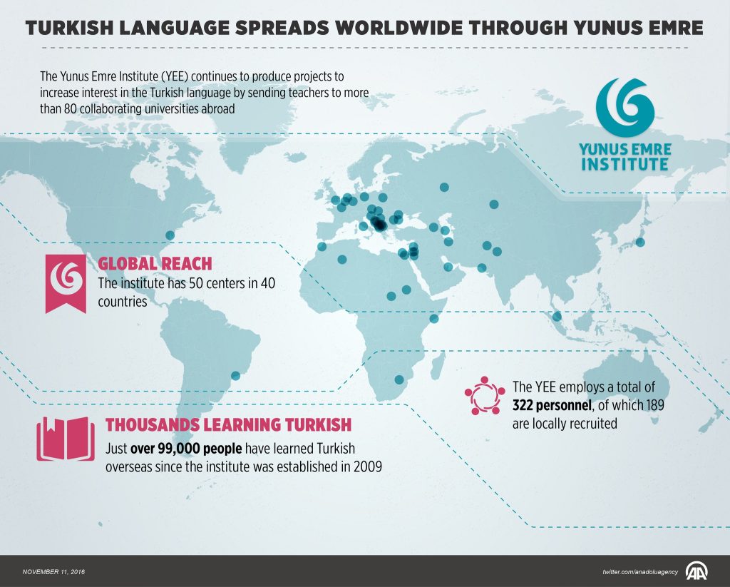 Τα κέντρα Yunus Emre ιδρύθηκαν στην Αλβανία, το Βέλγιο, τη Βοσνία, τη Γεωργία,την Αγγλία, το Ιράν, την Ιαπωνία, το Καζακστάν, την Τουρκική Βόρεια Κύπρο, το Κοσσυφοπέδιο, το Λίβανο, την Ουγγαρία, την Αίγυπτο, την Πολωνία, τη Ρουμανία και τη Συρία. Οι τοποθεσίες των κέντρων αντικατοπτρίζουν την έμφαση που δίνεται στα Yunus Emre Enstitüsü (Ινστιτούτο Γιουνούς Εμρέ) του οποίου τα παραρτήματα βρίσκονται σε 42 χώρες ενώ διαθέτει 135 συνεργάτες σε 60 χώρες.