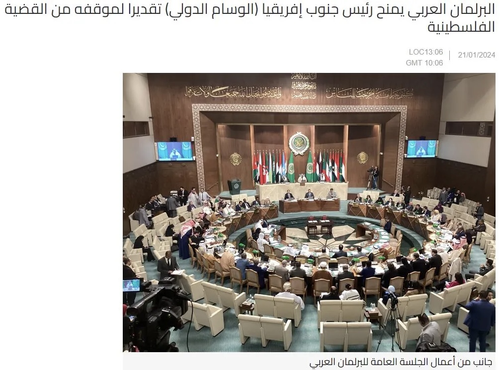 Ο Πρόεδρος του Αραβικού Κοινοβουλίου, Άντελ Αμπντέλ Ραχμάν αλ Ασόμι, ανακοίνωσε ότι ο Νοτιοαφρικανός Πρόεδρος Σίριλ Ραμαφόζα τιμήθηκε με το Διεθνές Μετάλλιο στο όνομα του αραβικού λαού, το οποίο είναι η υψηλότερη τιμή που απονέμεται από το αραβικό κοινοβούλιο σε διεθνείς ηγέτες και διοικητές που υποστηρίζουν τα ζητήματα του αραβικού έθνους και συμβάλλουν στη νίκη του.