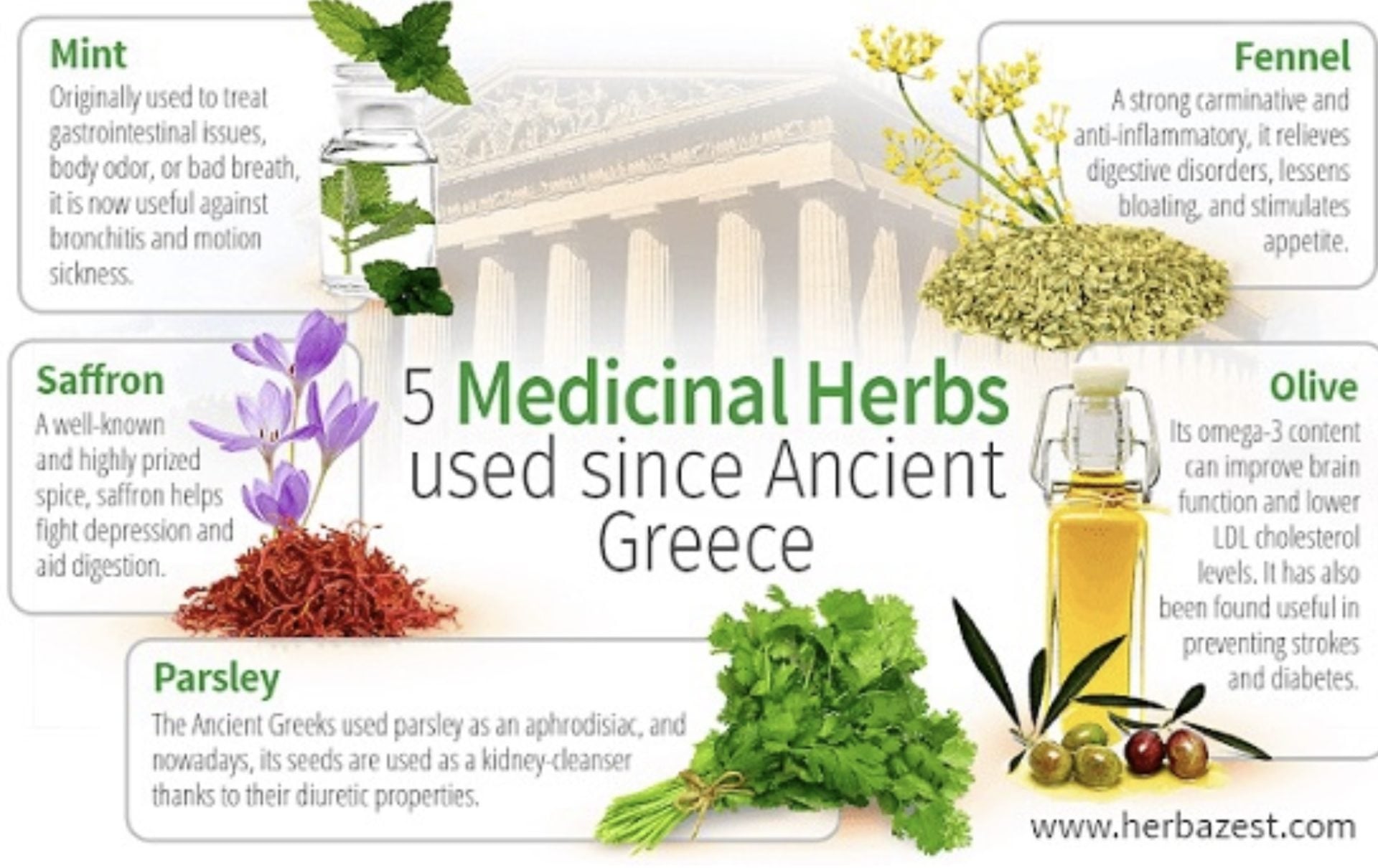 Πασίγνωστα ήταν τα μεγάλα μαντεία θεραπευτήρια της αρχαιότητας στον Ελλαδικό χώρο, με επικεφαλής τα Ασκληπιεία. Οι Έλληνες έχουν τον Αριστοτέλη με 500 περίπου φάρμακα στην «Ιστορία των Φυτών». Ο πατέρας της παγκόσμιας Ιατρικής ο Ιπποκράτης ο Κώος (460-337 π.Χ.) στα συγγράμματα του αποδίδονται στην εμπειρία του, αναφέρει 400 δείγματα φαρμακευτικών ουσιών από φυτά. Μετά είναι ο Ερέσιο Τύρταμο, τον πασίγνωστο Θεόφραστο (372-287 π.Χ.). στο βιβλίο του «Περί Φυτών Ιστορίαι», που σώζεται, θεμελιώνονται οι βάσεις της βοτανικής. Μάζευε από παντού πληροφορίες και στα 450 φυτά που περιγράφει, αναφέρει και τις φαρμακευτικές του εφαρμογές. Ο Διοσκουρίδης (Κιλικία 1ος μ.Χ. αι.) θεωρείται ο «θεμελιωτής της φαρμακολογίας». Οι γνώσεις του για την θεραπευτική δράση των φυτών, δεν ξεπεράστηκαν για αιώνες. Ο άλλος μεγάλος γιατρός της αρχαιότητας, ο Γαληνός (129-199 μ.Χ.) παρασκεύασε τα φυσικά θεραπευτικά σχήματα, που ονομάστηκαν «Γαληνικά σκευάσματα» που ίσχυαν έως τον 18α αι. Συνέγραψε 300 περίπου βιβλία, σε ένα από τα οποία τα φυτά με αλφαβητική σειρά.