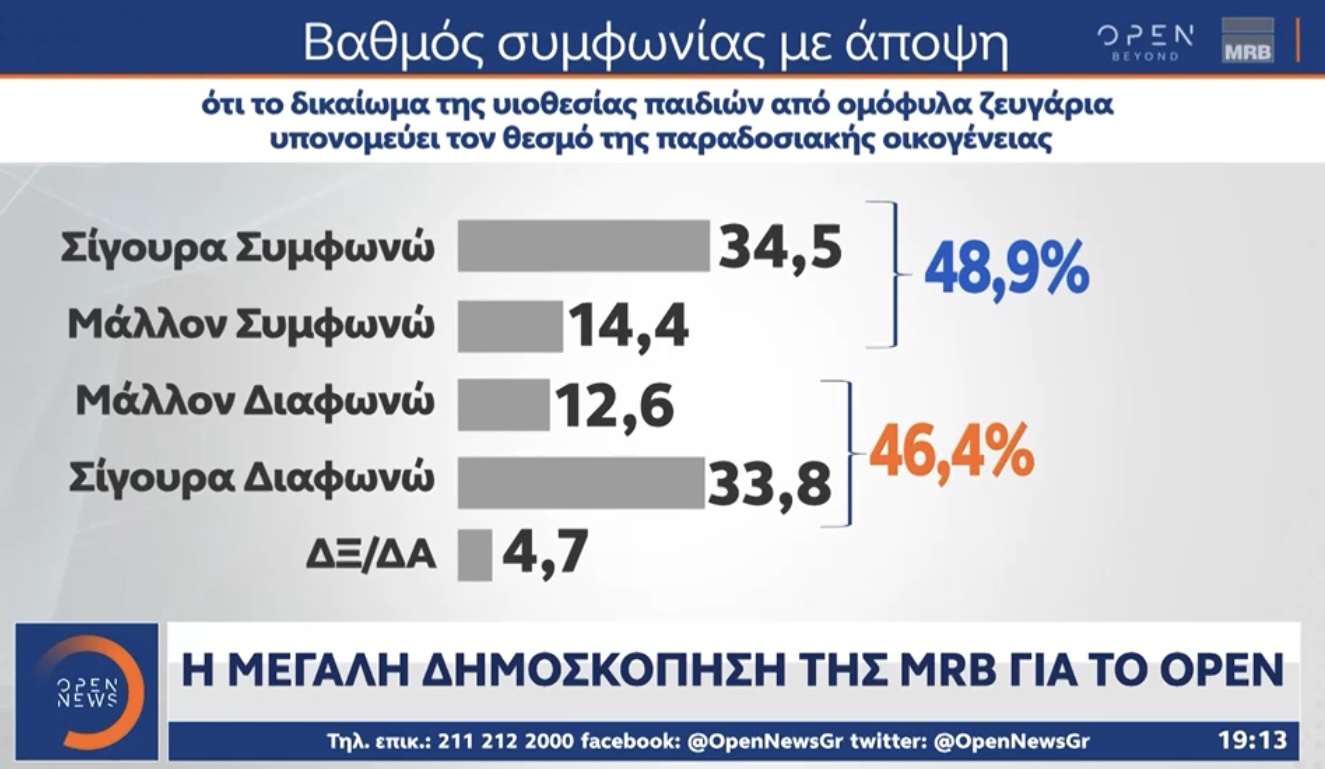 Κόλαφος για την επιμονή της κυβέρνησης και προσωπικά του Κυριάκου Μητσοτάκη, τα αποτελέσματα δημοσκόπησης της MRB που παρουσιάστηκε στο OPEN και καταδεικνύει τη συντριπτική διαφωνία της κοινωνίας για την τεκνοθεσία των ομόφυλων ζευγαριών στο νομοσχέδιο της κυβέρνησης.