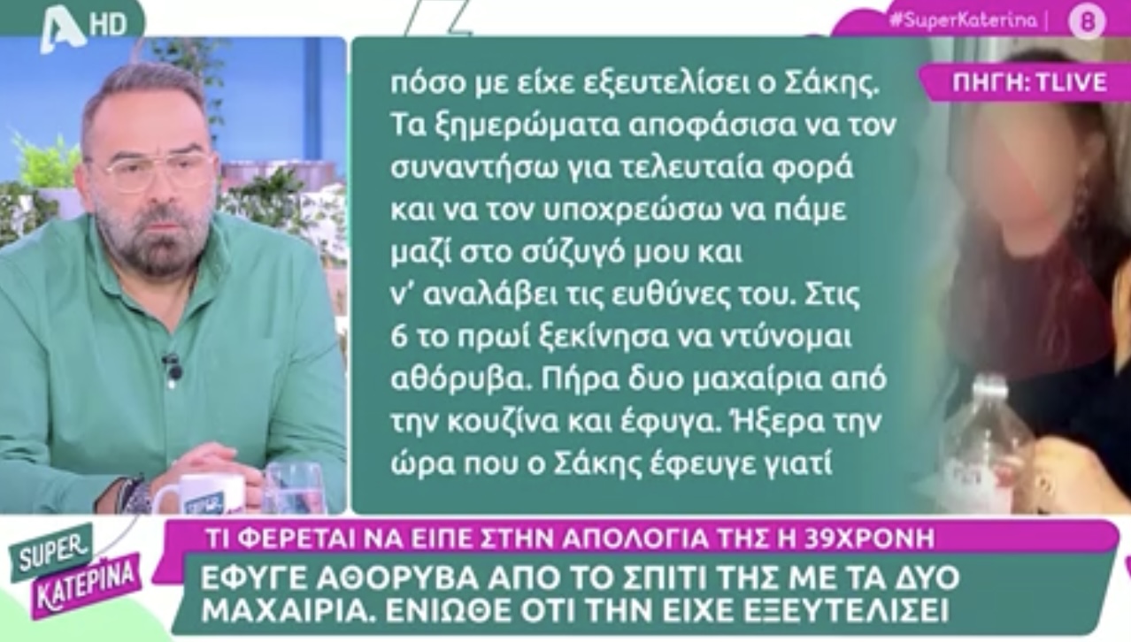«Βρήκα που είχε σταθμεύσει το αυτοκίνητό του και περίμενα εκεί κοντά. Όταν ο Σάκης μπήκε στο αυτοκίνητο, εγώ άνοιξα την πόρτα και δείχνοντας το μαχαίρι του είπα “πάμε τώρα στον άνδρα μου να του μιλήσεις, να αναλάβεις τις ευθύνες σου και να του εξηγήσεις τι έχει συμβεί”. Μου απάντησε ”πάρε δρόμο” και κινήθηκε προς εμένα και σήκωσε το χέρι του για να με χτυπήσει. Από αντίδραση, ξεκίνησα να τον μαχαιρώνω.