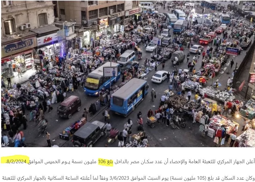 Η Κεντρική Υπηρεσία Δημόσιας Κινητοποίησης και Στατιστικής ανακοίνωσε ότι ο πληθυσμός της Αιγύπτου έφτασε τα 106 εκατομμύρια άτομα την Πέμπτη, 8 Φεβρουαρίου 2024.