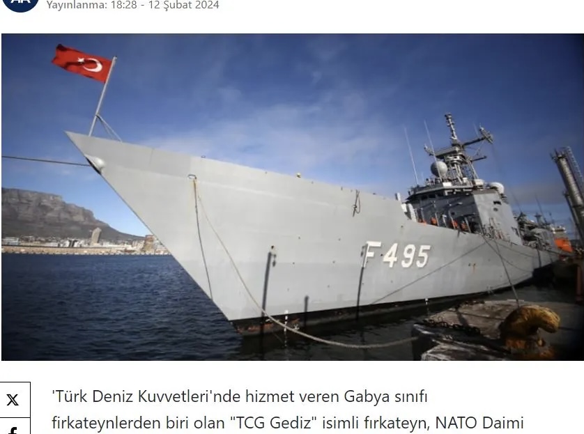 Η φρεγάτα «TCG Gediz», μία από τις φρεγάτες κλάσης Gabya που υπηρετεί στις τουρκικές ναυτικές δυνάμεις, έφτασε στο λιμάνι του Πειραιά, στην Ελλάδα, στο πλαίσιο της Μόνιμης Ναυτικής Ομάδας του ΝΑΤΟ.