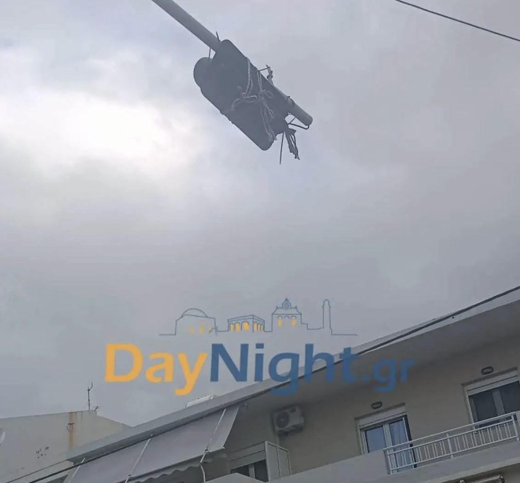 Στην οδό Ηγουμένου Γαβριήλ, λίγο πριν το κλειστό γυμναστήριο «Μελίνα Μερκούρη», ένα φανάρι είχε δεθεί με σχοινί για να μην πέσει στα κεφάλια οδηγών και πεζών!