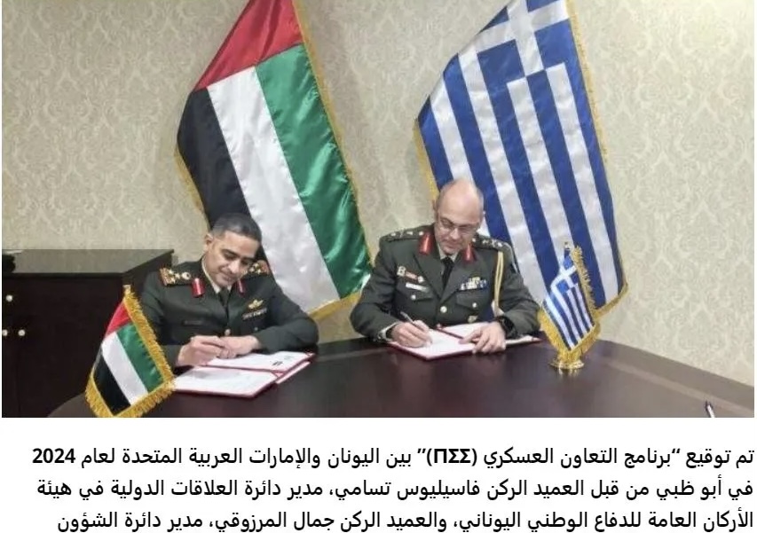 Το «Πρόγραμμα Στρατιωτικής Συνεργασίας (ΠΣΣ)» μεταξύ Ελλάδας και Ηνωμένων Αραβικών Εμιράτων για το 2024 υπέγραψαν στο Άμπου Ντάμπι ο Ταξίαρχος Βασίλειος Τσάμης, Διευθυντής του Τμήματος Διεθνών Σχέσεων του Γενικού Επιτελείου Εθνικής Άμυνας και ο Ταξίαρχος Τζαμάλ Αλ. Μαρζούκι, Διευθυντής του Τμήματος Διεθνών Υποθέσεων των Δυνάμεων Ενόπλων Δυνάμεων των ΗΑΕ, γράφουν τα αραβικά media.