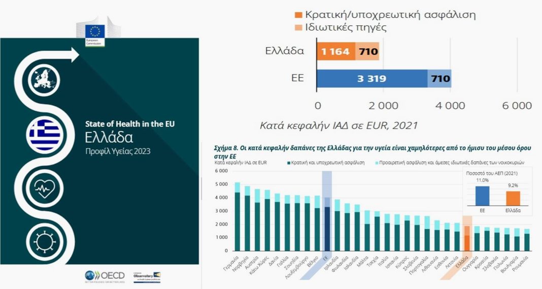 Με 1874 EUR κατά κεφαλήν το 2021, η Ελλάδα διέθεσε λιγότερο από το ήμισυ του μέσου όρου των συνολικών δαπανών για την υγεία σε ολόκληρη την ΕΕ. Οι δημόσιες δαπάνες αποτελούν τη βασική πηγή χρηματοδότησης (62 %), αλλά είναι σημαντικά χαμηλότερες από τον μέσο όρο της ΕΕ που ανέρχεται σε 81 %. Το μεγαλύτερο μέρος των ιδιωτικών δαπανών έχει τη μορφή άμεσων ιδιωτικών πληρωμών (33 %), ποσοστό που υπερβαίνει κατά πολύ τον μέσο όρο της ΕΕ (15 %)
