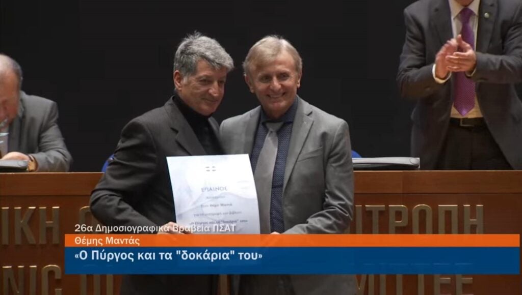 Με μια σημαντική διάκριση για τον γνωστό αθλητικογράφο από τον Πύργο, Θέμη Μαντά, την Ηλεία, την ομάδα του Πανηλειακού και φυσικά τον κόσμο της πραγματοποιήθηκε την Τρίτη (27/02), η τελετή απονομής των 26ων Αθλητικών Δημοσιογραφικών Βραβείων του Πανελλήνιου Συνδέσμου Αθλητικού Τύπου (ΠΣΑΤ) για το 2023. Πρόκειται για έναν θεσμό που έχει καταξιωθεί στο χρόνο, μοναδικός μεταξύ των δημοσιογραφικών Ενώσεων και φορέων.