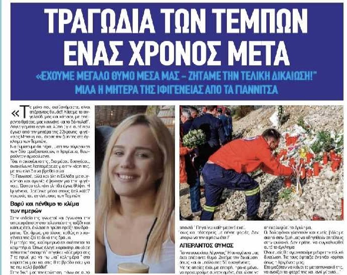 Να θυμίσουμε ότι πέρσι, μετά την σύγκρουση των δύο αμαξοστοιχιών, η Ιφιγένεια, θεωρούνταν αγνοούμενη. Τότε η οικογένεια της , δια μέσου δικηγόρου, ανακοίνωνε λεπτομέρειες για την κόρη της, με την ελπίδα να βρεθεί σώα. Τα Γιαννιτσά, αλλά και όλη η Ελλάδα, με συγκίνηση και αγωνία έψαχναν για την Ιφιγένεια. Ώσπου τελικά η ελπίδα έγινε θλίψη. Η Ιφιγένεια, βρέθηκε μέσα στους (τελικά) 57 νεκρούς του εγκλήματος των Τεμπών.