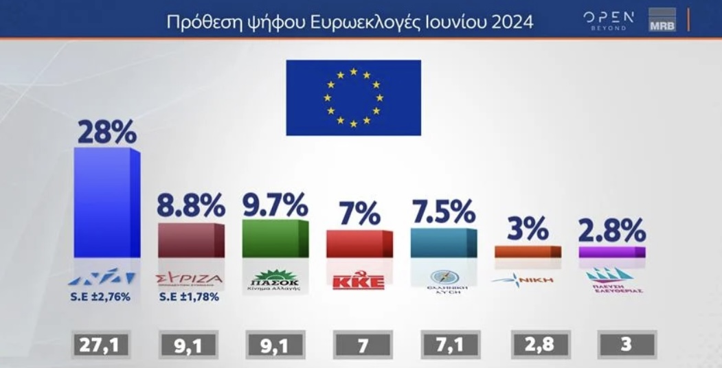 Αναφορικά, με την πρόθεση ψήφου για τις επερχόμενες ευρωεκλογές του Ιουνίου 2024, η ίδια δημοσκόπηση δείχνει τα εξής:
