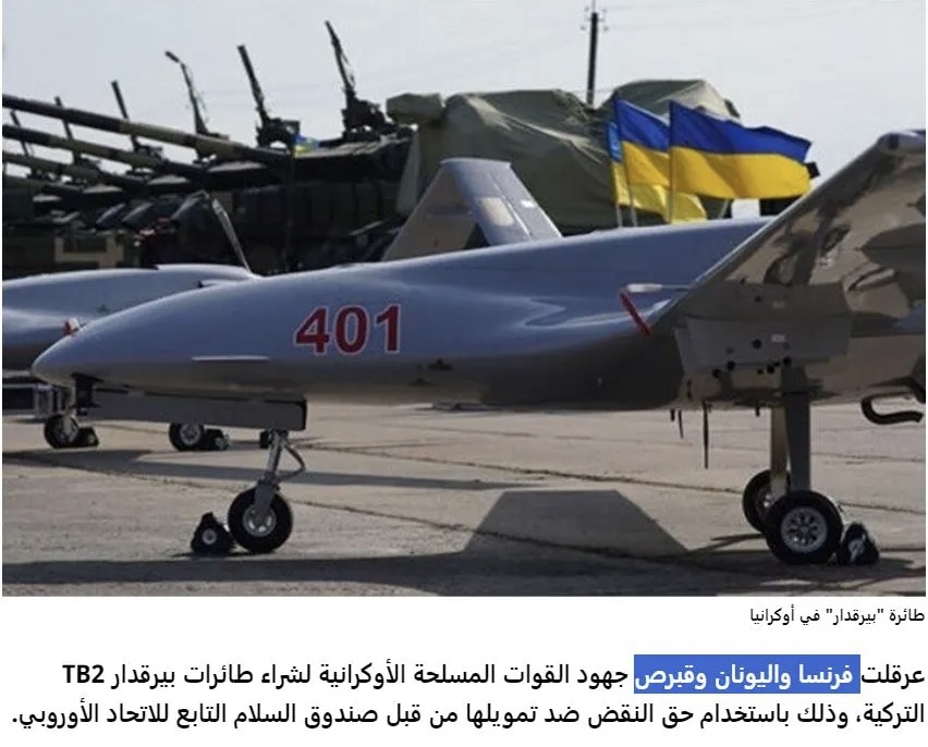 Η Γαλλία, η Ελλάδα και η Κύπρος έχουν εμποδίσει τις προσπάθειες των ουκρανικών ενόπλων δυνάμεων να αγοράσουν τουρκικά αεροσκάφη Bayraktar TB2, ασκώντας βέτο στη χρηματοδότησή τους από το Ταμείο Ειρήνης της Ευρωπαϊκής Ένωσης, γράφει αραβικό δημοσίευμα.