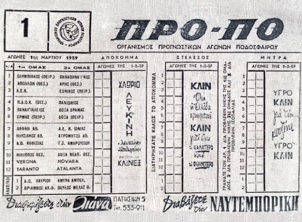 Το 1958 ιδρύθηκε ο Οργανισμός Προγνωστικών Αγώνων Ποδοσφαίρου (ΟΠΑΠ), ένας αποκεντρωμένος δημόσιος οργανισμός, που ανέλαβε τη διοργάνωση του παιγνιδιού, αντιγράφοντας το ιταλικό TotoCalcio. Την Κυριακή 1η Μαρτίου 1959 έγινε ο πρώτος διαγωνισμός. Χιλιάδες Έλληνες ανταποκρίθηκαν και έσπευσαν στα λιγοστά τότε πρακτορεία να προβλέψουν την έκβαση 12 αγώνων με τα σημεία 1, 2, Χ και να καταθέσουν τον οβολό τους. Ανάμεσα στους αγώνες δέσποζε το ντέρμπι των αιωνίων, στο οποίο επικράτησε ο Ολυμπιακός με 2-0.