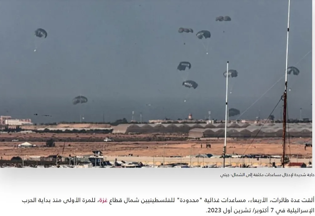 Την Τετάρτη, πολλά αεροπλάνα έριξαν «περιορισμένη» επισιτιστική βοήθεια στους Παλαιστίνιους στη βόρεια Λωρίδα της Γάζας, για πρώτη φορά από την έναρξη του ισραηλινού πολέμου στις 7 Οκτωβρίου 2023, όπως γράφει αραβικό δημοσίευμα.