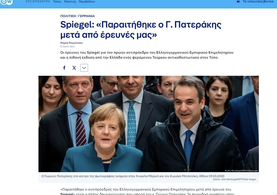 Τα ονόματα δύο Ελλήνων υπουργών της κυβέρνησης Μητσοτάκη συμπεριλαμβάνονται στην έρευνα του Spiegel για τους λόγους που οδήγησαν σε παραίτηση τον αντιπροέδρου του Ελληνογερμανικού Εμπορικού Επιμελητηρίου Γιώργου Πατεράκη.