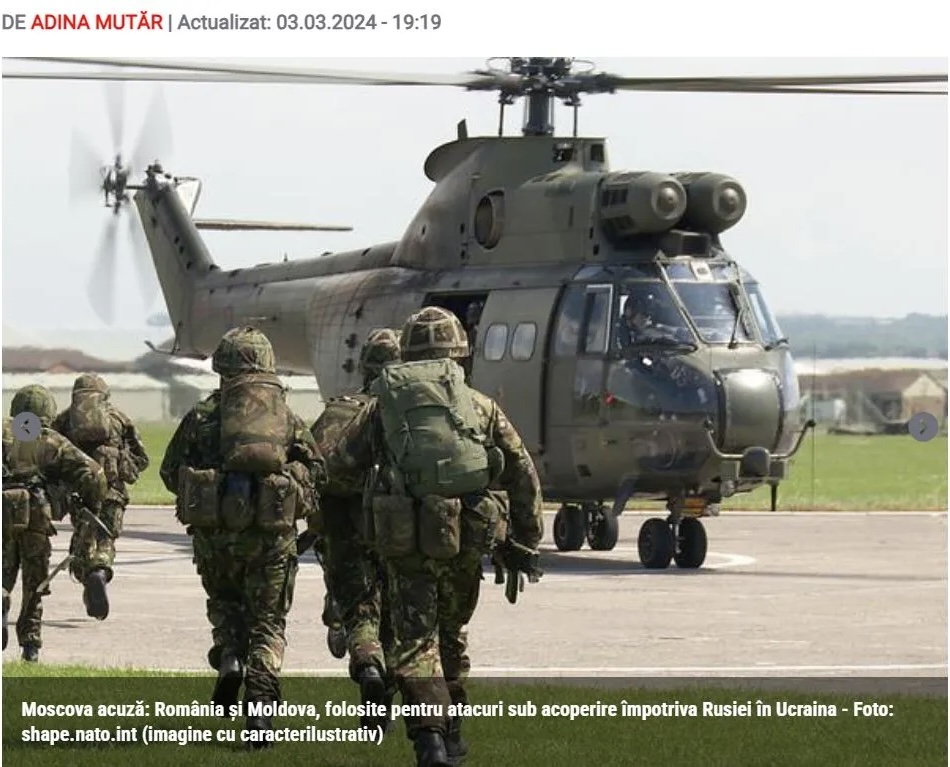 Το κανάλι ‘Rybar’ στο Telegram, που είναι προσκείμενο στο Κρεμλίνο, κατηγορεί την Ρουμανία ότι απορροφά την Μολδαβία προκειμένου να σχηματίσει μια κοινή «βάση» για τα στρατεύματα του ΝΑΤΟ που θα επιχειρούν μυστικά στην Ουκρανία, αναφέρουν σήμερα ρουμανικά δημοσιεύματα.