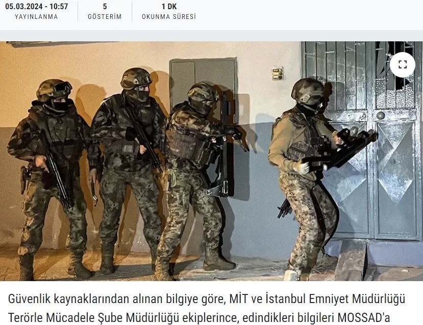 Σύμφωνα με πληροφορίες των πηγών ασφαλείας, πραγματοποιήθηκε επιχείρηση από το τμήμα αντικατασκοπείας της MİT και του Τμήματος Αντιτρομοκρατικής Αστυνομίας της Κωνσταντινούπολης κατά των υπόπτων που φέρεται να πούλησαν τις πληροφορίες που απέκτησαν στη Μοσάντ.