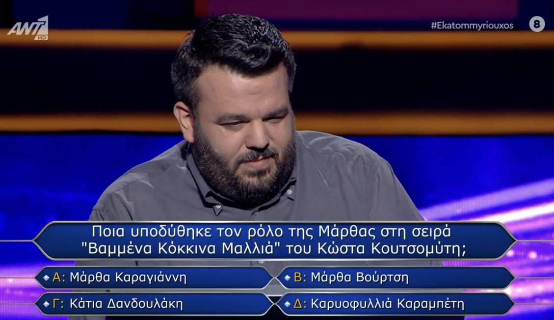 Η ερώτηση αφορούσε μια απο τις πιο πετυχημένες τηλεοπτικές σειρές του Αντ1 που εχει γράψει ιστορία, τα Βαμμένα Κόκκινα Μαλλιά του Κωστα Κουτσομυτη βασισμένη στο βιβλιο του Κωστα Μουρσελά.
